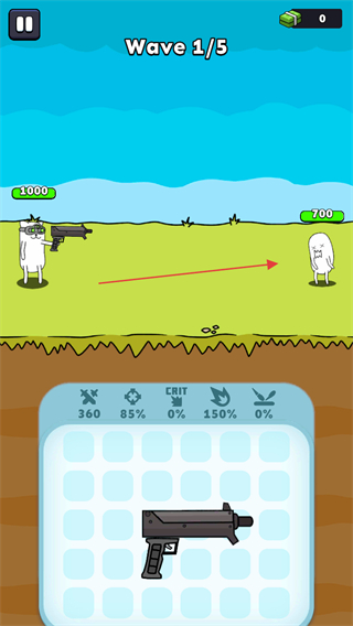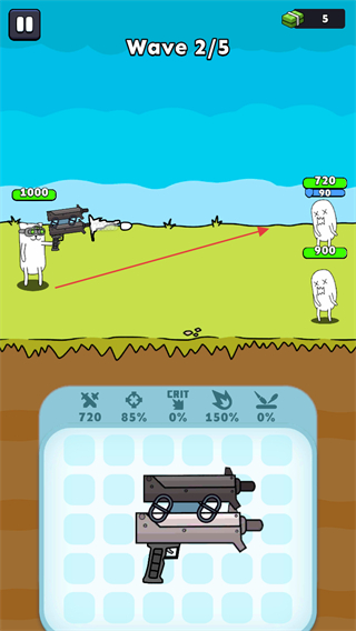1、進(jìn)入游戲查看波次Wave1/5,用初始武器攻擊前方敵人。