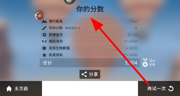 4、游戲結束后,查看分數(shù)界面,了解滑行距離、金幣獲取等情況,可選擇再試一次提升分數(shù)。