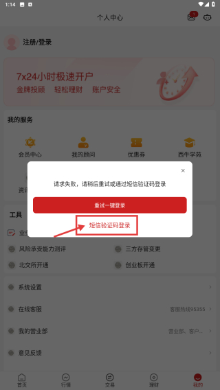 2、在個(gè)人中心,點(diǎn)擊注冊(cè)/登錄區(qū)域,觸發(fā)登錄方式選擇彈窗。