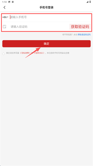 4、在手機(jī)號(hào)登錄頁面,輸入手機(jī)號(hào)碼和驗(yàn)證碼,點(diǎn)擊確定按鈕,完成賬號(hào)登錄操作。