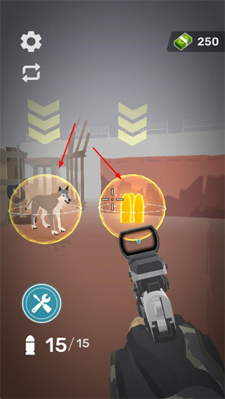 1、操控槍械射擊敵人,造成傷害,界面會顯示彈藥數(shù)量和傷害數(shù)值。