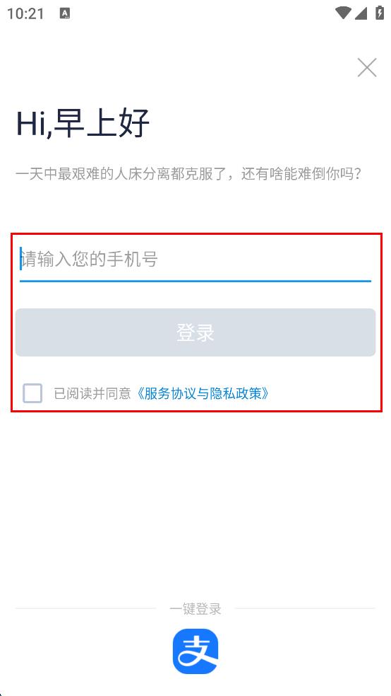 4、在登錄界面,先勾選“已閱讀并同意服務(wù)協(xié)議與隱私政策,然后在輸入框中輸入自己的手機(jī)號,最后點擊“登錄”按鈕,完成登錄流程。