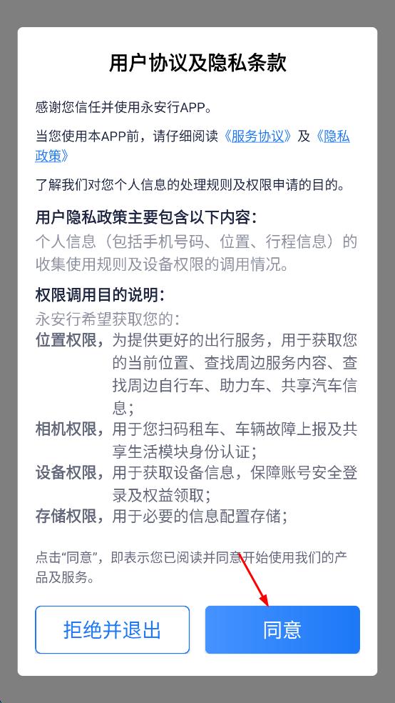 1、打開永安行APP,首先會看到“用戶協(xié)議及隱私條款”頁面,仔細(xì)閱讀相關(guān)內(nèi)容后,點擊“同意”按鈕,進(jìn)入APP主界面。