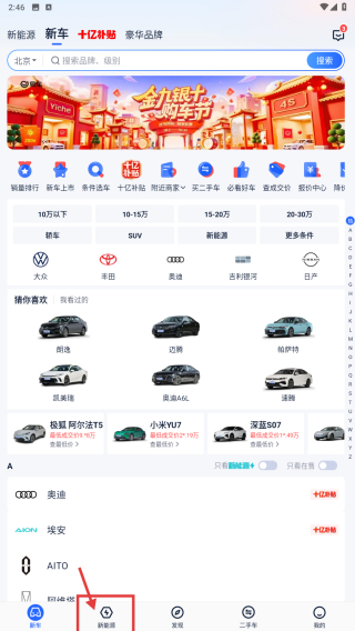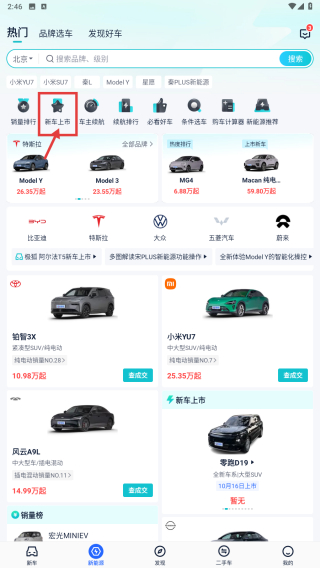 1、打開汽車類APP,點(diǎn)擊底部選車選項(xiàng),進(jìn)入選車頁面后,點(diǎn)擊新車上市分類,查看近期上市的新車列表。