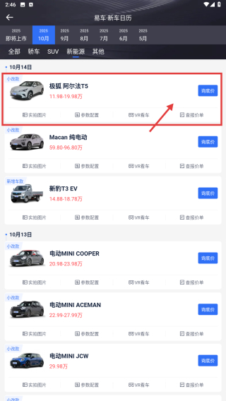 2、在新車上市列表中,點(diǎn)擊極氪阿爾法T5車型條目,進(jìn)入該車型詳情頁面。