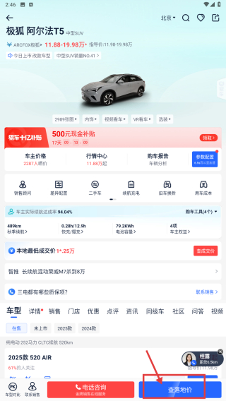 4、若需進(jìn)一步了解購車優(yōu)惠或經(jīng)銷商報(bào)價(jià),在車型詳情頁面點(diǎn)擊查落地價(jià)按鈕,即可查看具體的價(jià)格明細(xì)及優(yōu)惠政策。