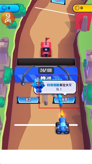 2、游戲過程中會出現(xiàn)帶有倍數(shù)的道具,射擊這些道具可以壯大隊伍。
