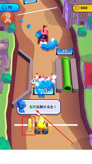 長按射擊按鈕就能發(fā)射炮彈人,還能巧妙利用倍數(shù)道具,讓炮彈人隊伍以驚人的速度壯大起來,不斷積攢力量為擊敗敵人做好準(zhǔn)備。