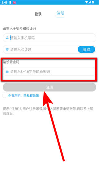 3、輸入驗證碼并設(shè)置密碼,勾選協(xié)議后點擊注冊,完成注冊。