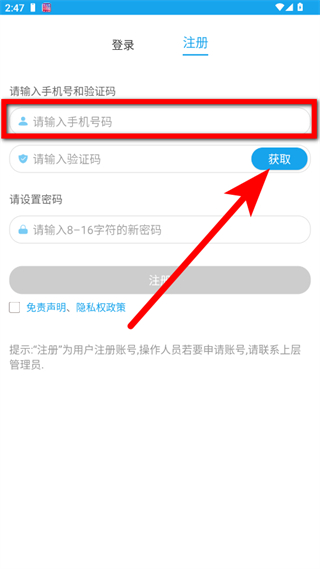 2、在注冊頁面,輸入手機(jī)號碼后,點擊獲取驗證碼。