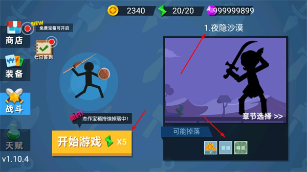2、可選擇關(guān)卡,點(diǎn)擊開始游戲進(jìn)入戰(zhàn)斗,關(guān)卡可能掉落金幣、普通物品、精良物品等獎(jiǎng)勵(lì)。