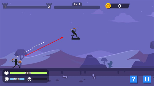 3、操控火柴人角色,投擲武器攻擊敵人,界面顯示生命值、護(hù)盾值和關(guān)卡進(jìn)度。