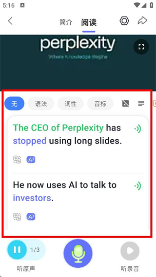 4、在文章閱讀頁面,可查看文章內(nèi)容并進(jìn)行聽原聲、聽錄音等操作。