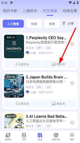 2、點(diǎn)擊要閱讀的文章對(duì)應(yīng)的看繪本,進(jìn)入文章簡(jiǎn)介頁面。