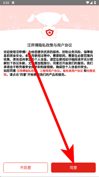 1、打開(kāi)汪師傅,在隱私政策與用戶(hù)協(xié)議彈窗中,點(diǎn)擊同意。