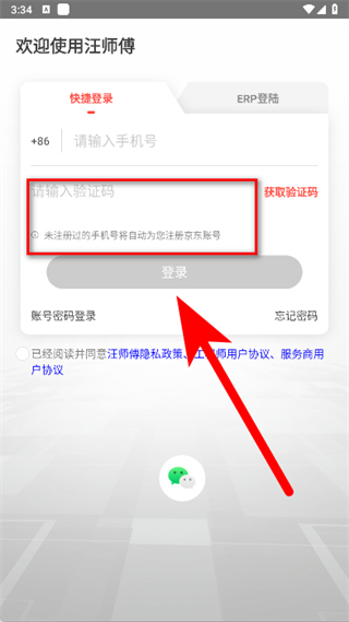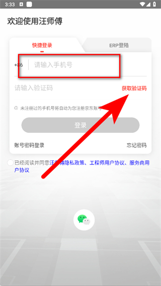 3、在快速登錄頁(yè)面,輸入手機(jī)號(hào)后,點(diǎn)擊獲取驗(yàn)證碼。