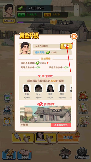 2、可對角色進(jìn)行升級,提升點擊收益和等級,消耗金幣進(jìn)行升級操作,同時助理和裝修也能帶來收益加成。