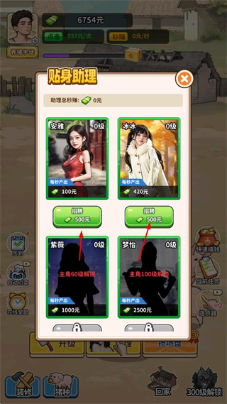 3、招聘貼身助理,不同助理每秒產(chǎn)出的金幣數(shù)量不同,消耗金幣招聘助理,提升每秒收益,部分助理需主角達(dá)到指定等級解鎖。