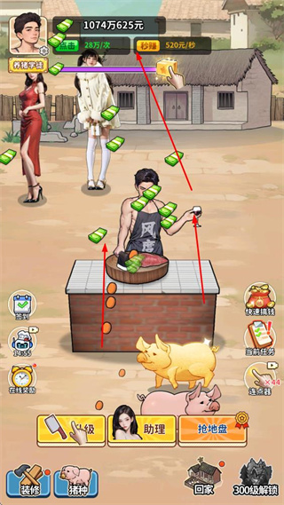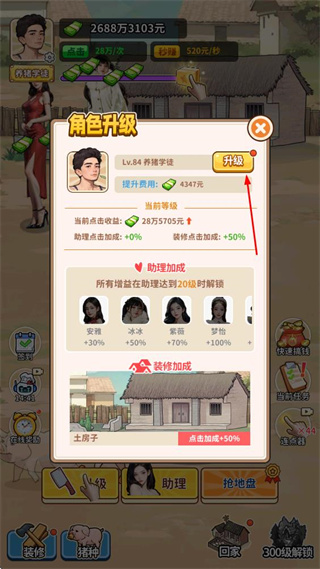 2、可對(duì)角色進(jìn)行升級(jí),提升點(diǎn)擊收益和等級(jí),消耗金幣進(jìn)行升級(jí)操作,助理和裝修也能帶來(lái)收益加成。