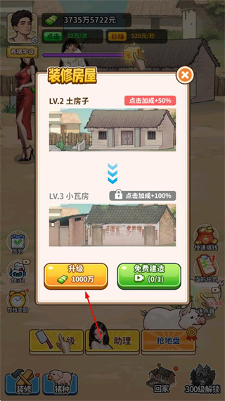 3、裝修房屋,提升房屋等級(jí),消耗金幣進(jìn)行升級(jí),或通過(guò)免費(fèi)建造次數(shù)升級(jí),提升點(diǎn)擊收益加成。