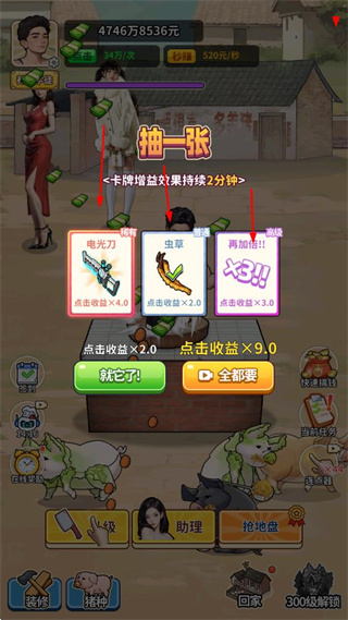 1、通過(guò)點(diǎn)擊操作和每秒自動(dòng)收益獲取金幣,界面顯示當(dāng)前金幣數(shù)量,同時(shí)可進(jìn)行升級(jí)、助理、搶地盤等操作。