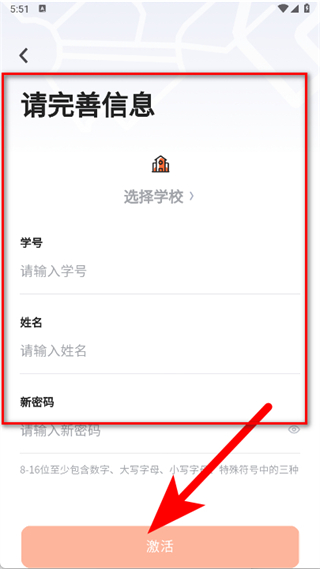 4、在完善信息頁面,選擇學(xué)校、輸入學(xué)號、姓名和新密碼,點擊激活,完成注冊。
