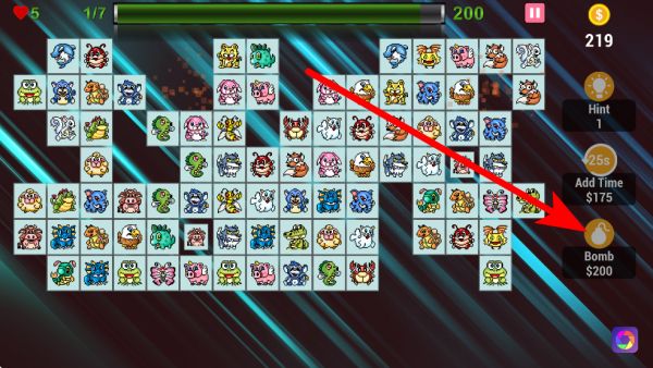 4、右側(cè)有炸彈道具,點(diǎn)擊后會(huì)直接用炸彈來消除動(dòng)物,幫助玩家在難以找到消除對(duì)象時(shí)找到思路,但炸彈道具數(shù)量有限,需合理使用。