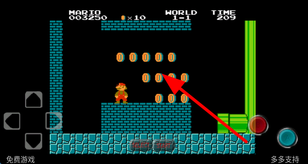 4、進入有金幣排列的區(qū)域,操控馬里奧移動,收集這些金幣,積累分數(shù),朝著關(guān)卡終點不斷前進。
