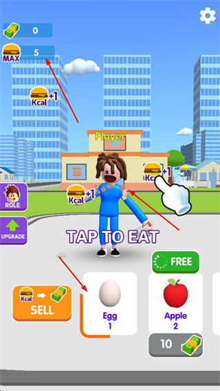 1、點(diǎn)擊食物進(jìn)行食用,獲取卡路里,這是積累資源的關(guān)鍵操作。