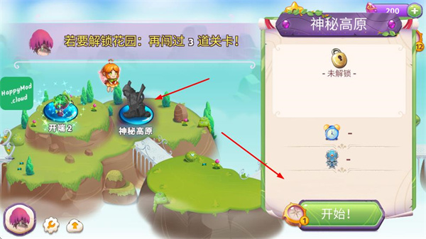 3、挑戰(zhàn)關(guān)卡,點擊開始按鈕進(jìn)入,完成關(guān)卡可解鎖新區(qū)域和獎勵,持續(xù)拓展花園內(nèi)容。