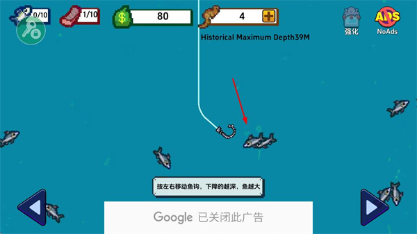 1、按左右鍵移動魚鉤,下得越深魚越大,開啟釣魚經(jīng)營之旅。