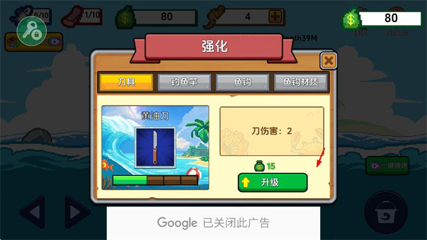 4、進(jìn)入強(qiáng)化界面,花費(fèi)資金升級刀具、釣魚竿等裝備,優(yōu)化工具性能,助力游戲進(jìn)程。