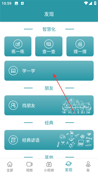 2、在發(fā)現(xiàn)頁面,點擊學一學,進入課程學習頁面。