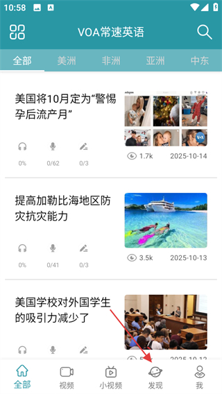 1、在VOA常速英語頁面,點擊底部發(fā)現(xiàn),進入發(fā)現(xiàn)頁面。