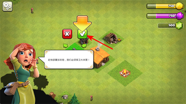 3、根據(jù)引導(dǎo),選擇建造防御建筑如大本營,點(diǎn)擊綠色對勾按鈕確認(rèn)建造,提升基地的防御能力,抵御進(jìn)攻。