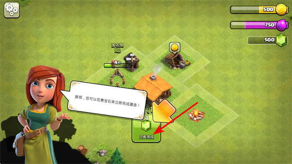4、在建造或升級建筑時,點(diǎn)擊立即完成按鈕,利用寶石加速建筑進(jìn)程,快速提升基地的建設(shè)和防御水平。