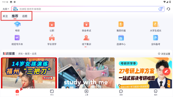 1、打開教育類APP,在首頁可通過關(guān)注推薦話題標(biāo)簽瀏覽不同類型的學(xué)習(xí)內(nèi)容,也可點(diǎn)擊考研公考等分類入口進(jìn)入對應(yīng)學(xué)習(xí)板塊。