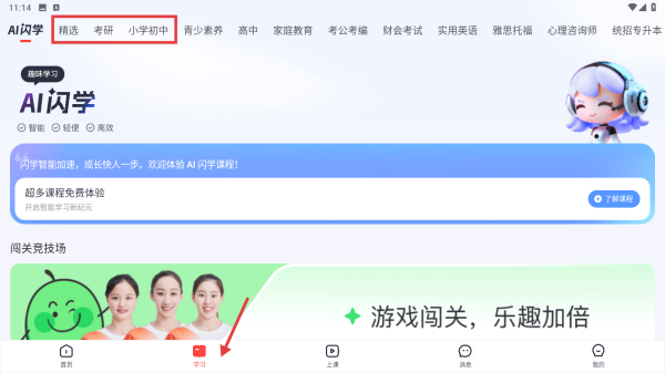 2、點(diǎn)擊底部學(xué)習(xí)選項(xiàng),進(jìn)入學(xué)習(xí)頁面后,可在AI閃學(xué)板塊選擇小學(xué)初中等學(xué)段分類,參與闖關(guān)競技場等趣味學(xué)習(xí)活動。