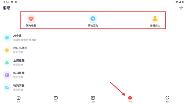 3、點(diǎn)擊底部消息選項(xiàng),可查看贊與收藏評論互動新增關(guān)注等消息通知,也可查看AI小途、社區(qū)小助手等發(fā)來的服務(wù)消息。