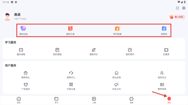 4、點(diǎn)擊底部我的選項(xiàng),進(jìn)入個(gè)人中心頁面后,可查看我的動態(tài)我的訂單學(xué)幣商城購物車等個(gè)人信息及服務(wù),也可使用緩存課程我的課程等學(xué)習(xí)服務(wù)功能。