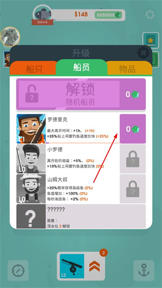 4、解鎖船員,提升釣魚相關(guān)屬性,優(yōu)化經(jīng)營效率,持續(xù)推動游戲發(fā)展。