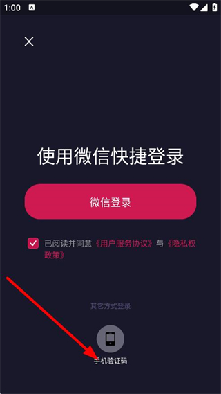 3、在登錄方式選擇頁(yè)面,點(diǎn)擊手機(jī)驗(yàn)證碼,進(jìn)入手機(jī)號(hào)登錄注冊(cè)頁(yè)面。