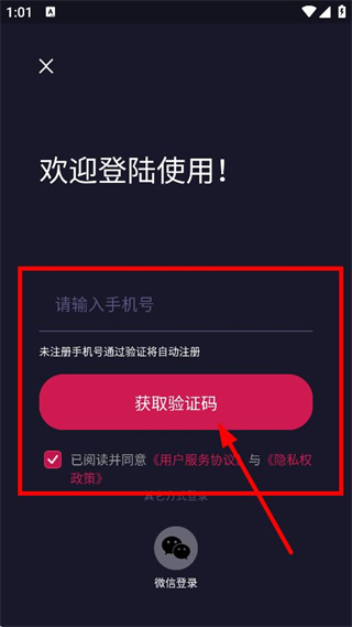 4、在手機(jī)號(hào)登錄注冊(cè)頁(yè)面,輸入手機(jī)號(hào)后點(diǎn)擊獲取驗(yàn)證碼,完成后續(xù)登錄或注冊(cè)操作。