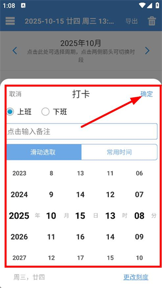 3、選擇上班/下班、輸入備注、選取時間后,點擊確定,完成打卡操作。