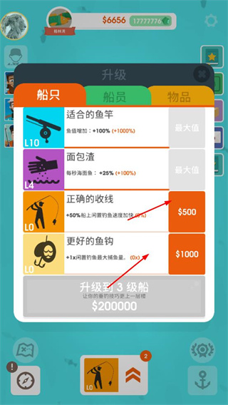 2、進入升級界面,花費金錢升級漁具,提升釣魚效率和收益,為經(jīng)營發(fā)展奠定基礎(chǔ)。