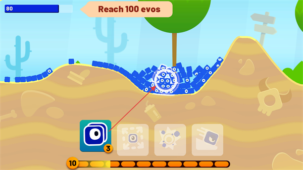 1、游戲開始,明確目標是Reach100evos,點擊屏幕下方技能圖標,發(fā)射藍色方塊。