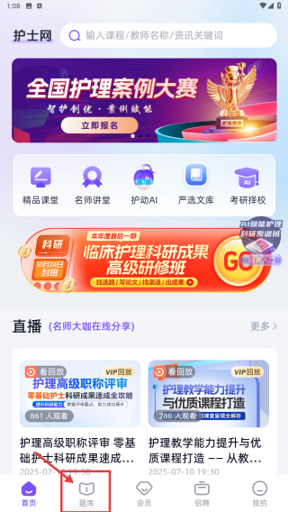 1、打開(kāi)護(hù)理考試學(xué)習(xí)應(yīng)用,點(diǎn)擊底部題庫(kù)選項(xiàng),進(jìn)入備考目標(biāo)選擇頁(yè)面。