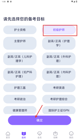2、在備考目標(biāo)頁(yè)面,選擇初級(jí)護(hù)師選項(xiàng)后點(diǎn)擊確定,進(jìn)入初級(jí)護(hù)師學(xué)習(xí)界面。