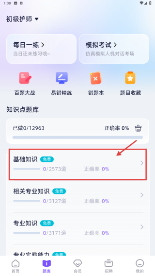 3、在初級(jí)護(hù)師界面,點(diǎn)擊基礎(chǔ)知識(shí)題庫(kù),進(jìn)入練習(xí)題頁(yè)面開(kāi)始做題。