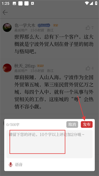 4、在評論輸入界面,輸入評論內(nèi)容后,點擊發(fā)布,完成評論發(fā)布。